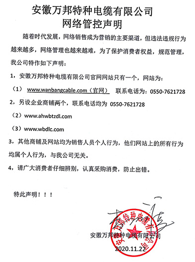 鄭重聲明:安徽萬邦特種電纜有限公司官方網站為:www_wanbangcable_com.txlintou.com,除此之外無任何子網站或合作網站,其余均為假冒偽劣。電話:0550-7621728 13485756353 地 址:安徽省天長市滁州高新技術產業開發區經四路29號